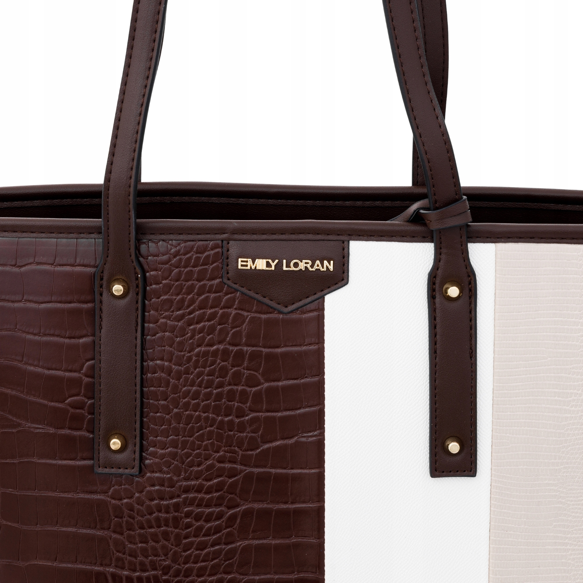 - Farbgebung: elegante Kombination aus Braun und Weiß mit Krokodillederstruktur, veredelt mit goldenen Details.