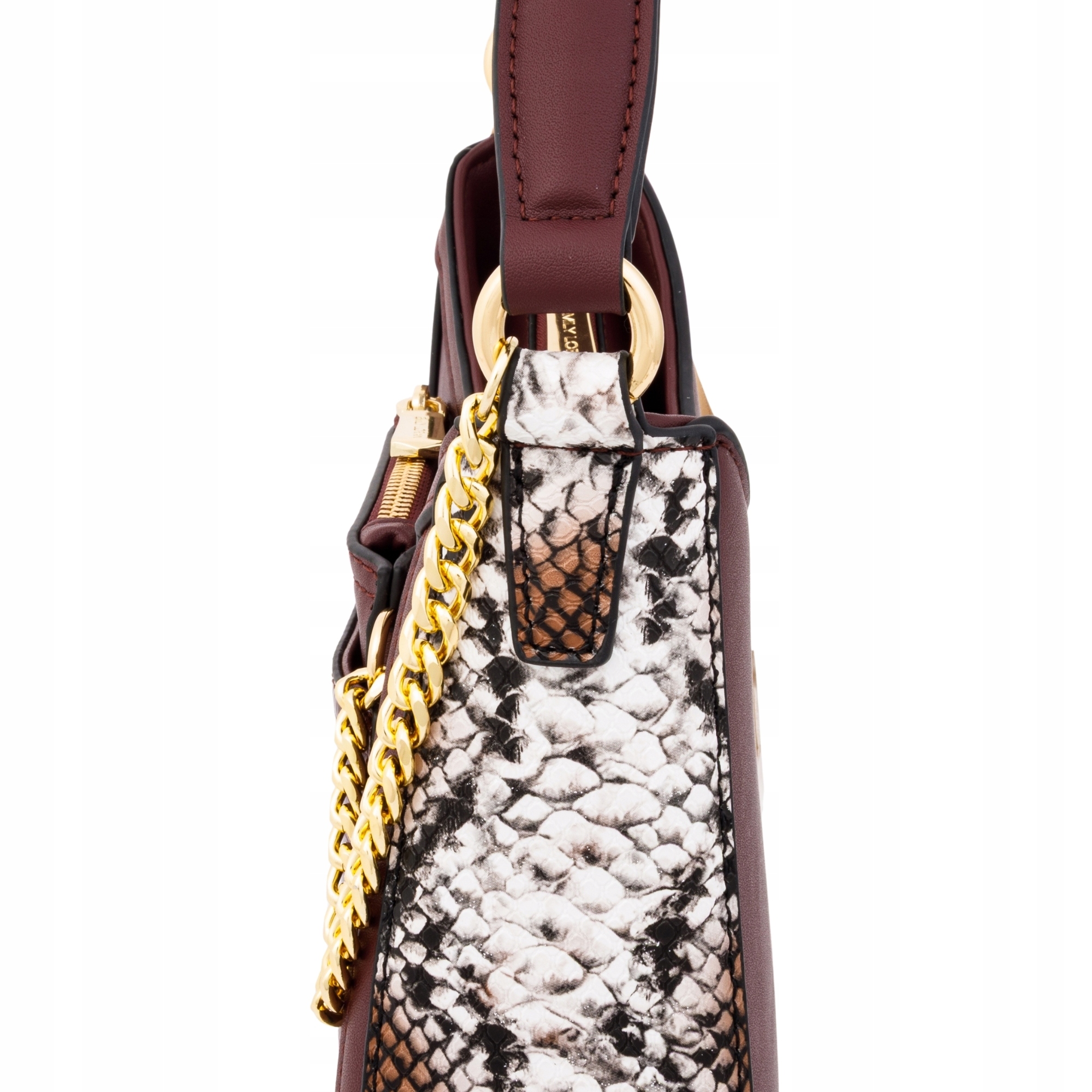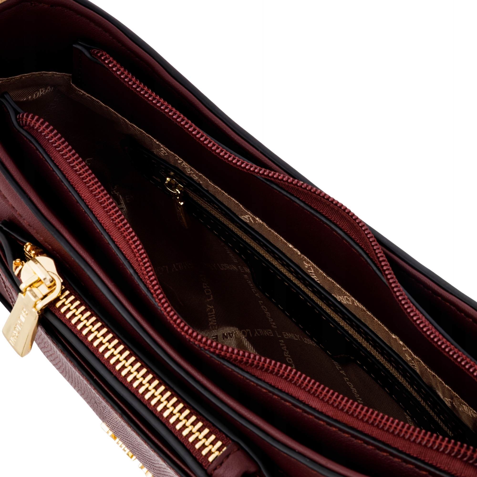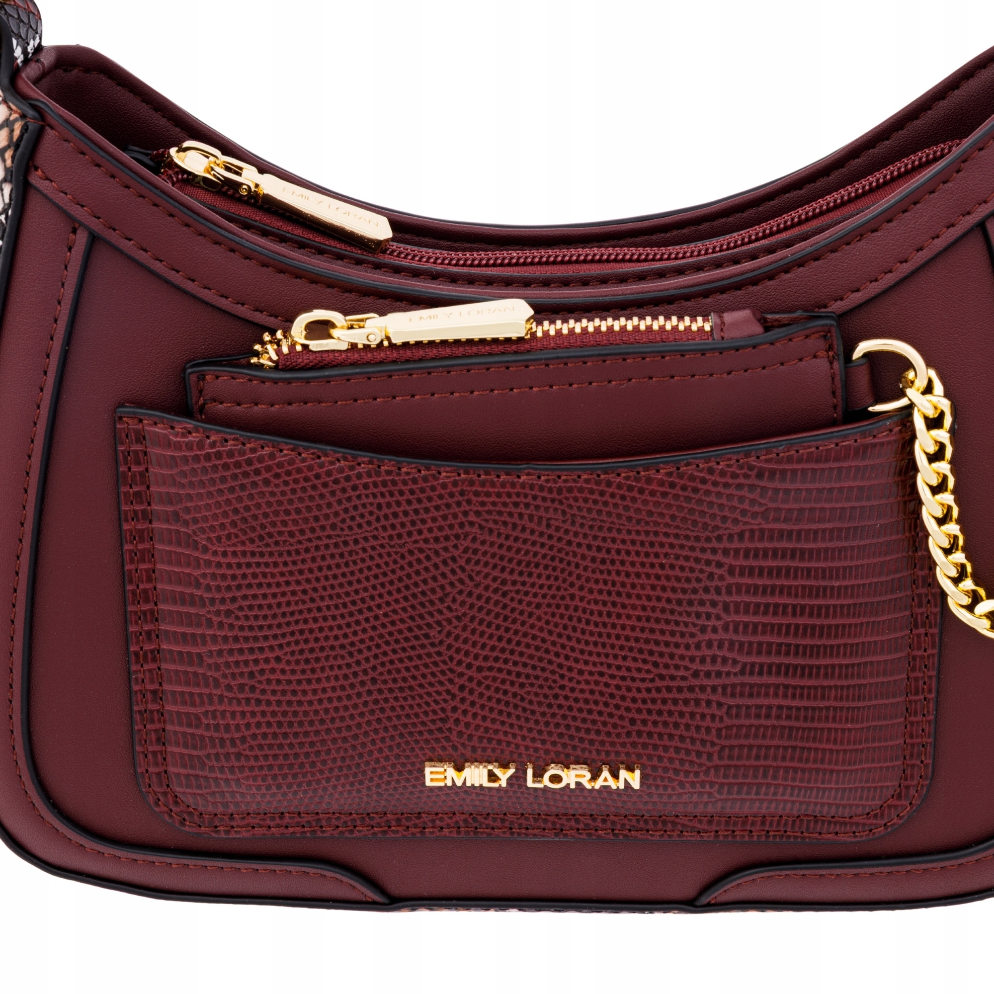 Diese Damenhandtasche aus der Kollektion Emily Loran ist ein Vorschlag für Frauen, die eine Kombination aus klassischem Stil und modernen Lösungen schätzen. Sie ist aus hochwertigem ökologischem Leder gefertigt und passt perfekt zu den aktuellen Modetrends. Die Vorderseite ist mit einer Prägung verziert, die eine Krokodilhaut imitiert, und einem dezenten goldenen Logo, das einen exklusiven Touch verleiht.