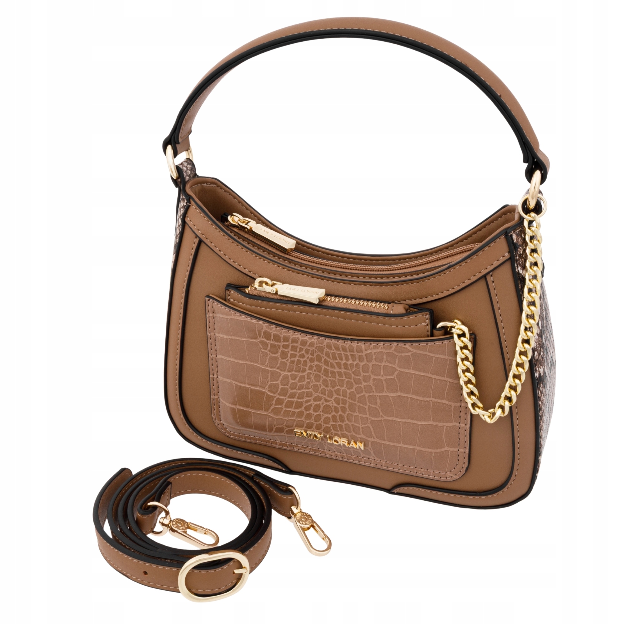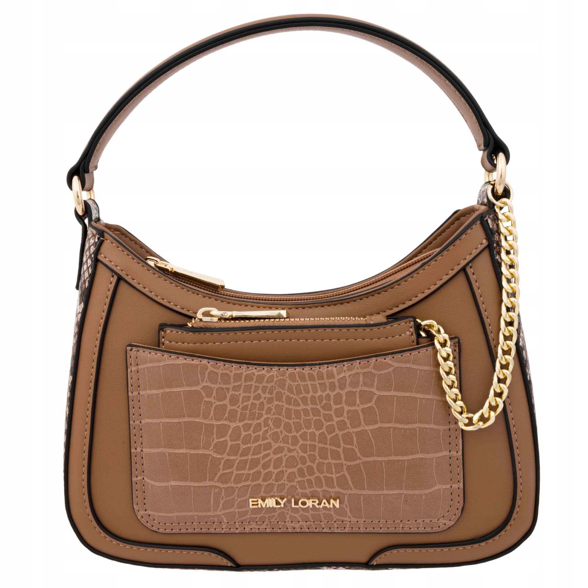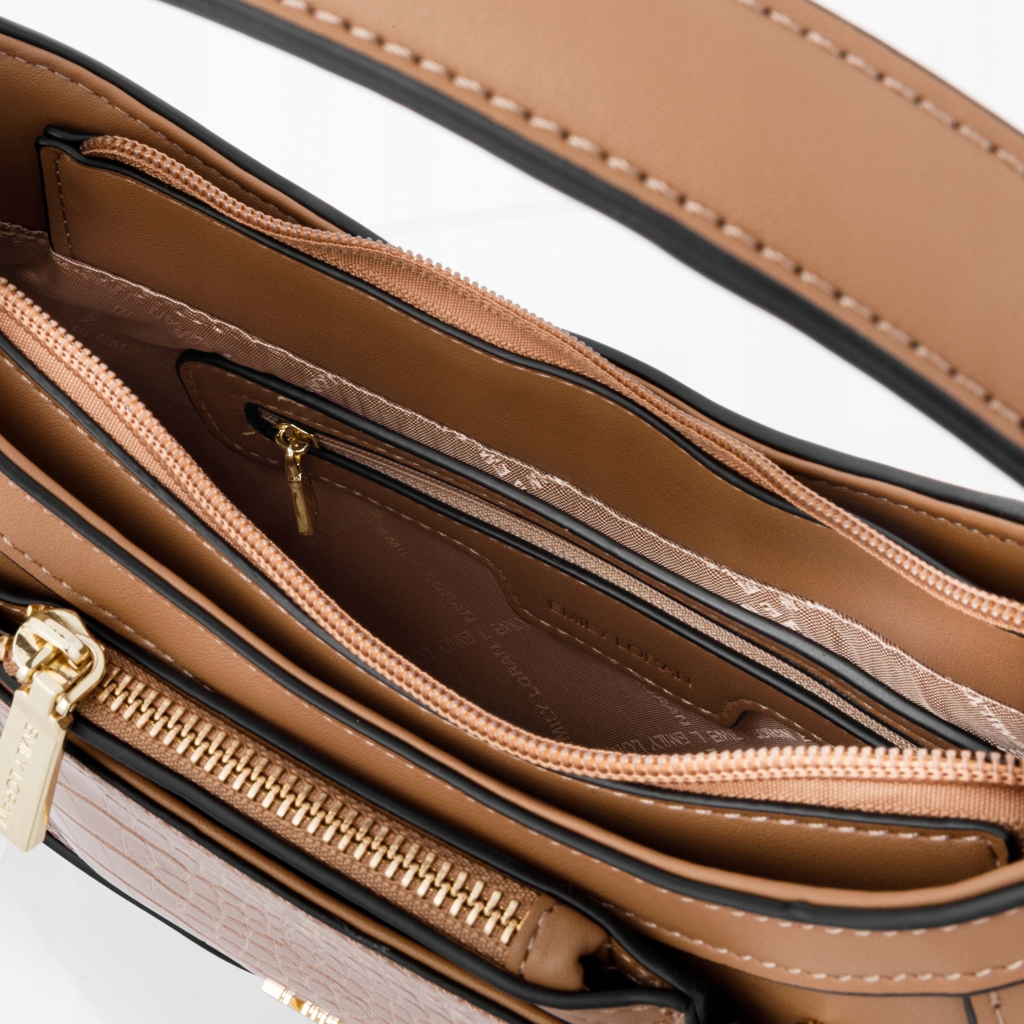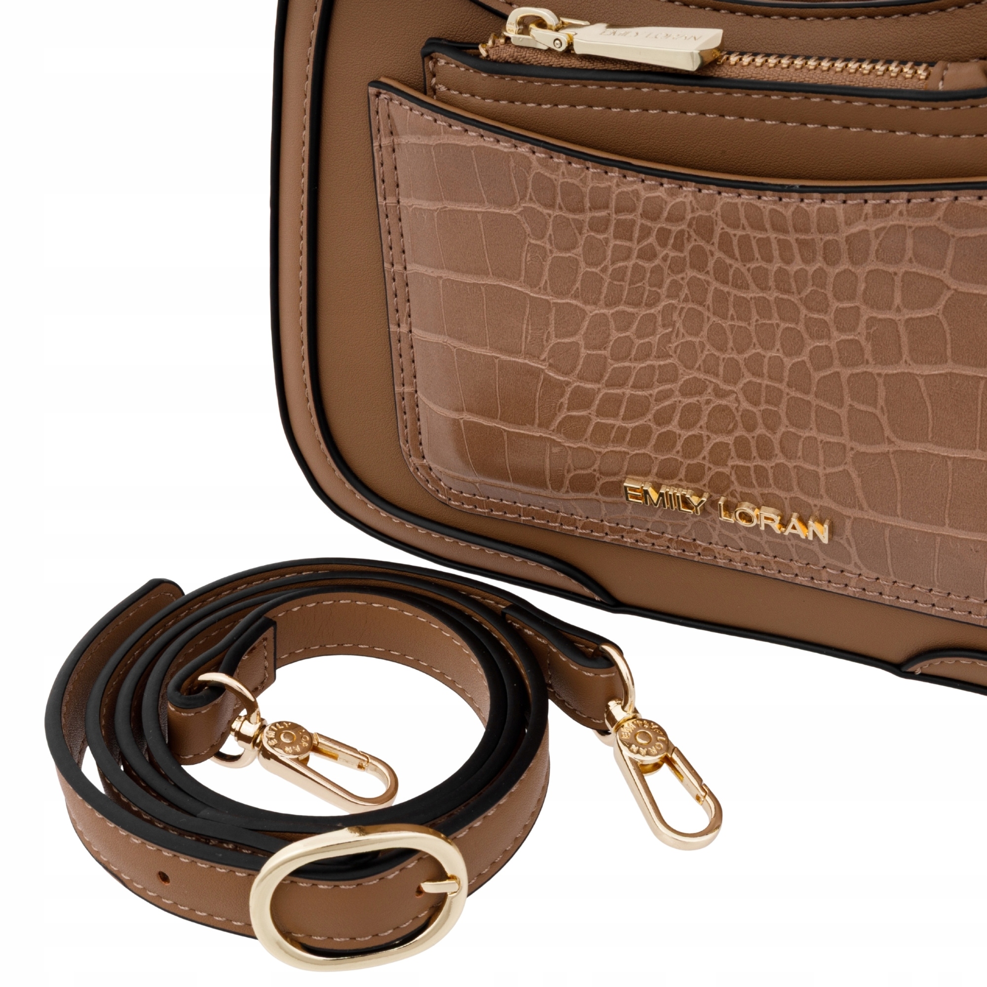 Diese Damenhandtasche aus der Kollektion Emily Loran ist ein Vorschlag für Frauen, die eine Kombination aus klassischem Stil und modernen Lösungen schätzen. Sie ist aus hochwertigem Öko-Leder in einem schönen Braunton gefertigt und passt perfekt zu den aktuellen Modetrends. Die Vorderseite ist mit einer Prägung verziert, die Krokodilleder imitiert, und einem dezenten goldenen Logo, das einen exklusiven Touch verleiht.