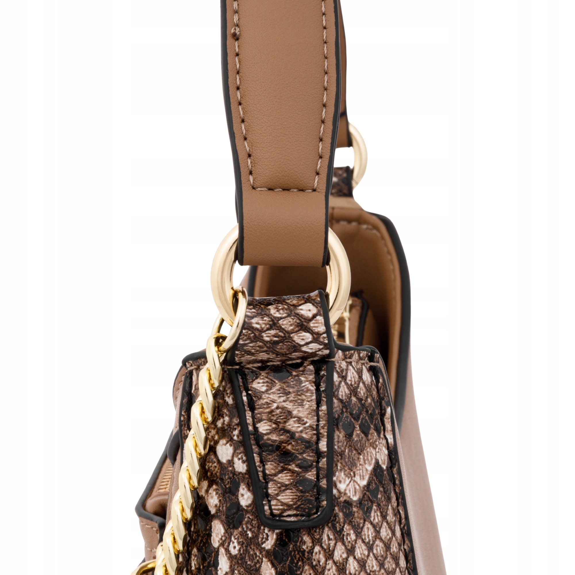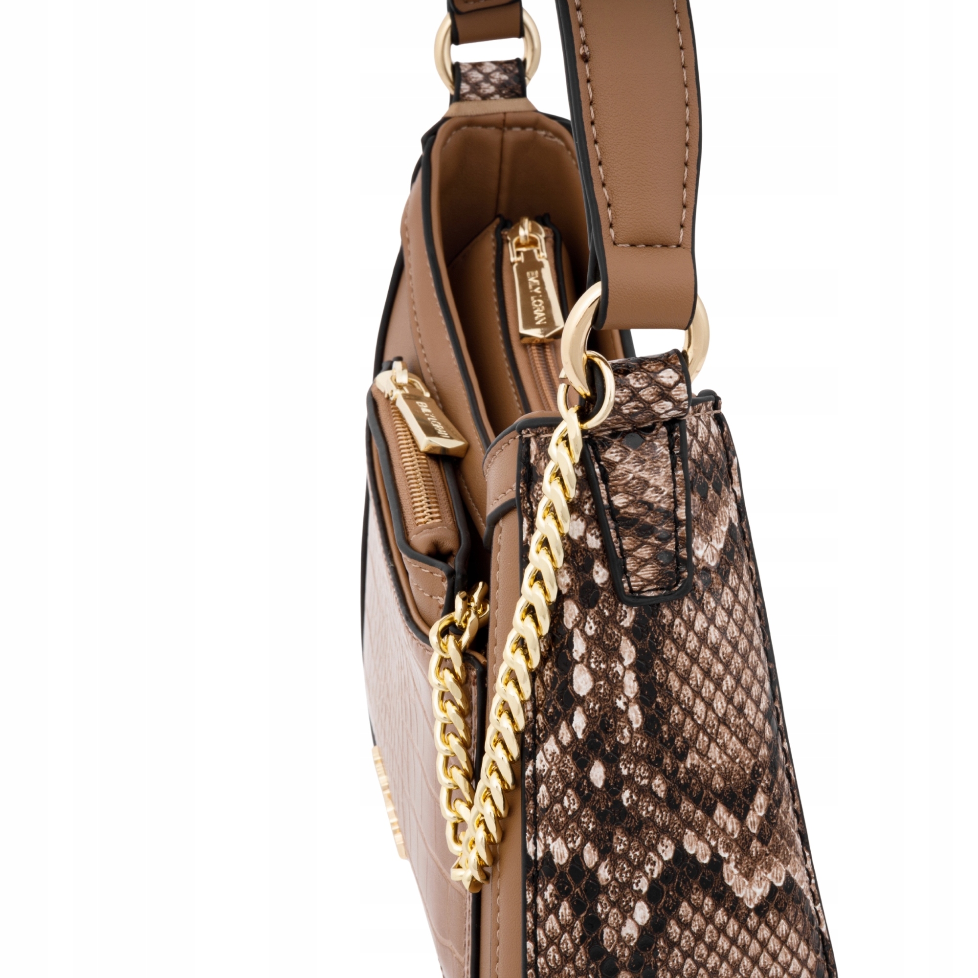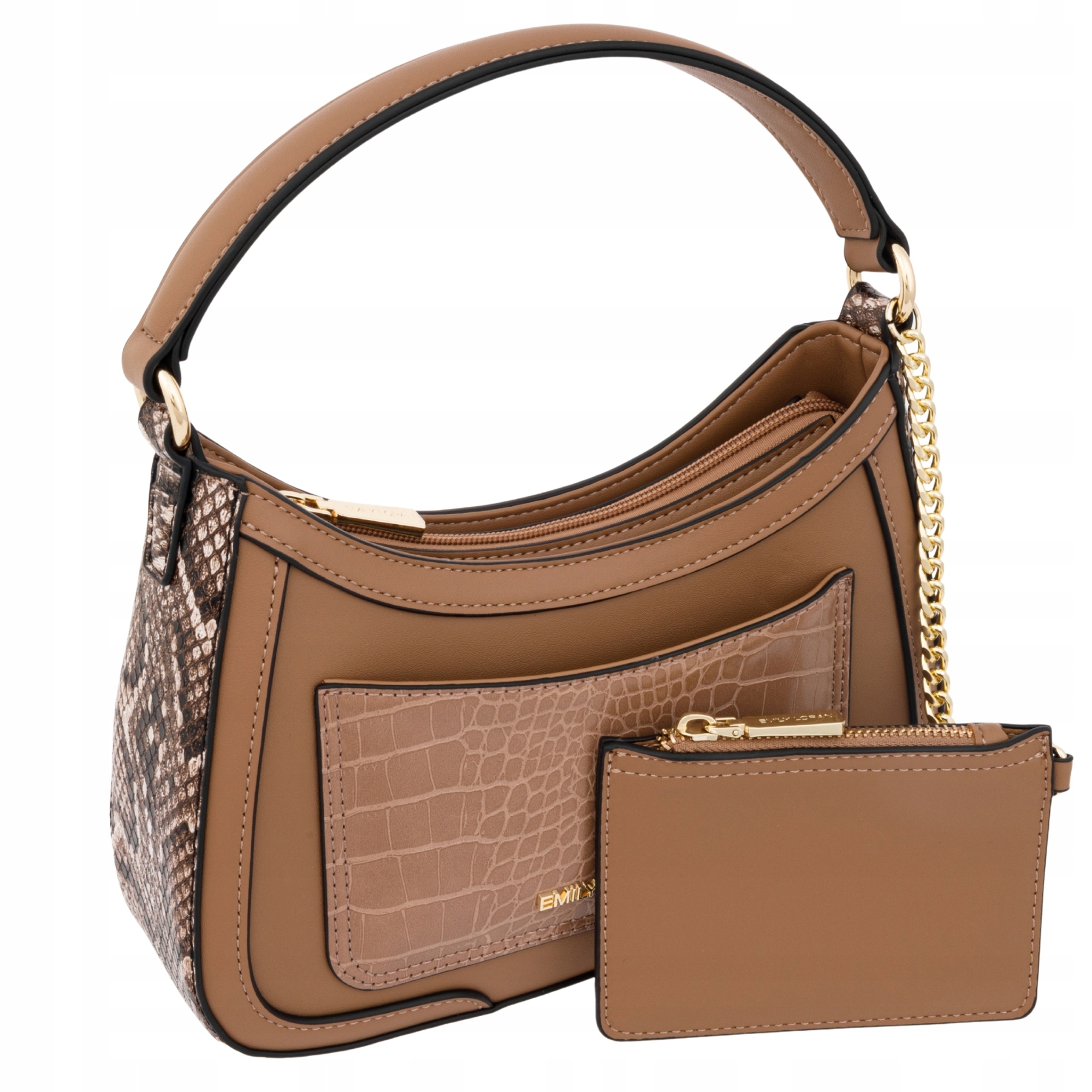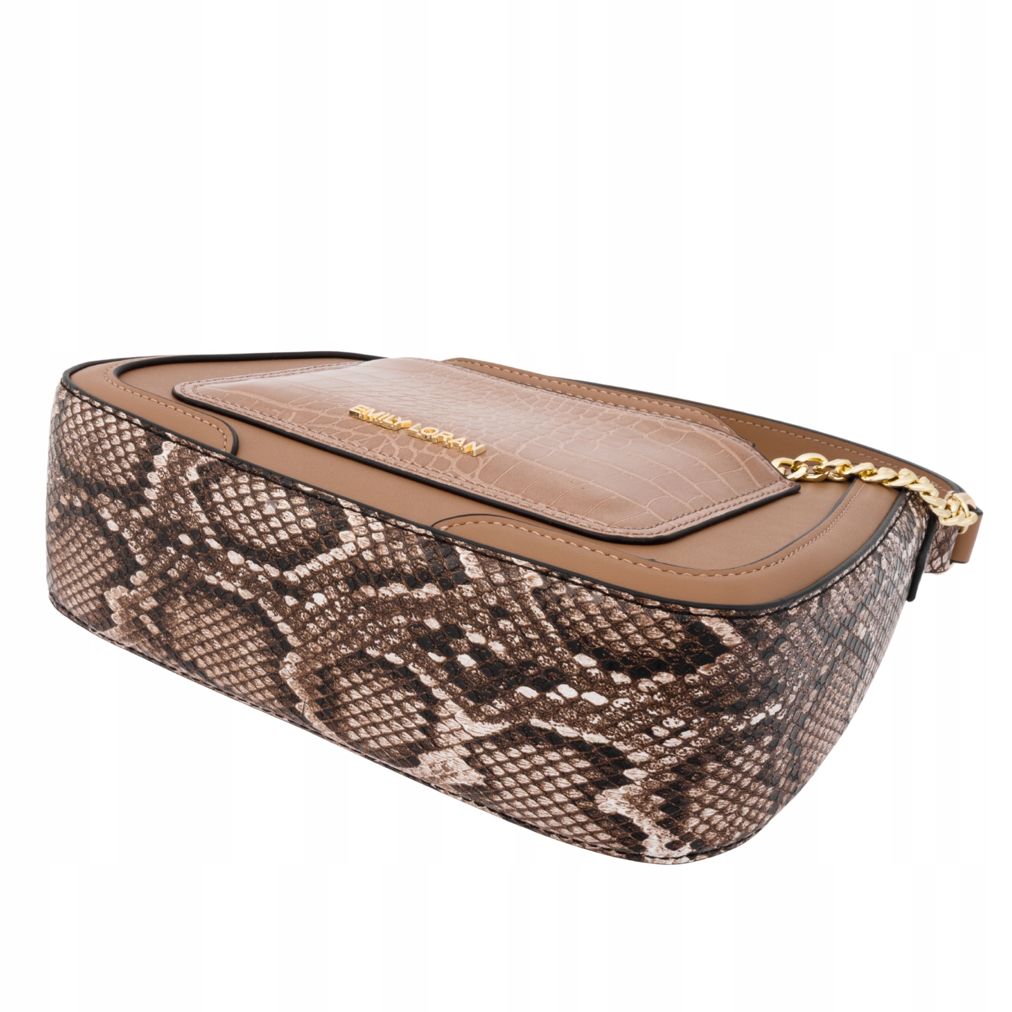 Diese Damenhandtasche aus der Kollektion Emily Loran ist ein Vorschlag für Frauen, die eine Kombination aus klassischem Stil und modernen Lösungen schätzen. Sie ist aus hochwertigem Öko-Leder in einem schönen Braunton gefertigt und passt perfekt zu den aktuellen Modetrends. Die Vorderseite ist mit einer Prägung verziert, die Krokodilleder imitiert, und einem dezenten goldenen Logo, das einen exklusiven Touch verleiht.