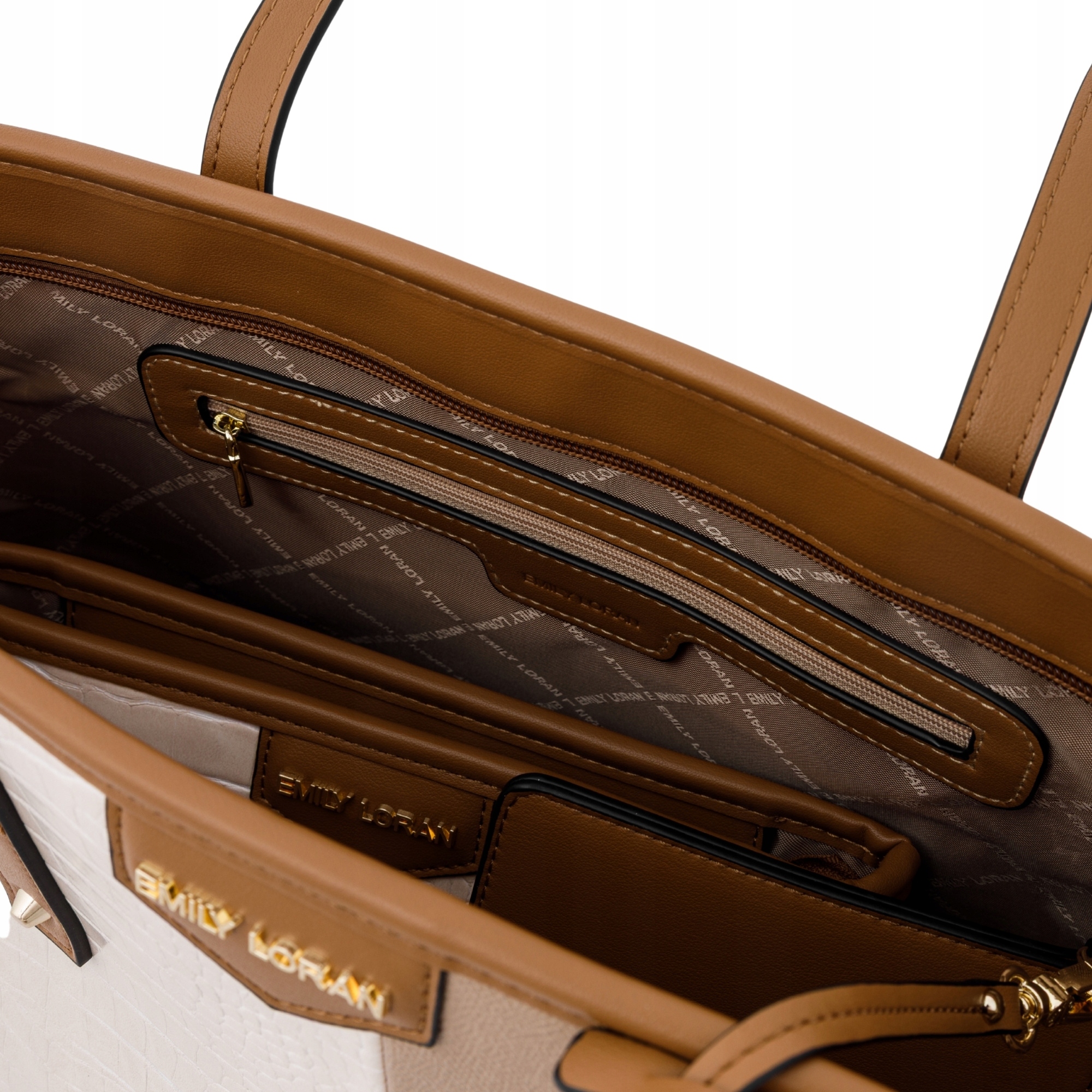 - Stilvolle Farbkombination: Hellbraun, Hellbeige und Karamell in verschiedenen Texturen (Krokodilleder, Glattleder, fein geprägter Stoff).